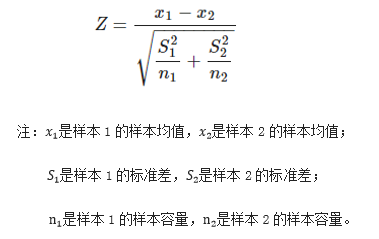 由于样本量大,我们可以采用Z检验。另外,对于较小的样本集合,我们可以依赖于T检验。通常我们通过Z值推导P值,AB测试计算Z值的计算公式为: