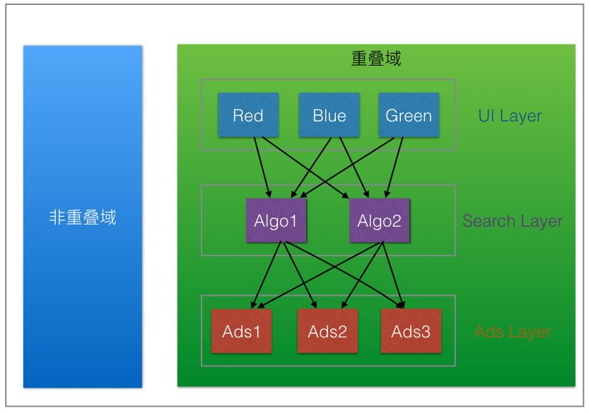 上述分层模型先将流量分为两个域,一个域只有一个单一层(非重叠域),和一个有三个层的重叠域,在这种情况下,每个请求会分到非重叠域或是重叠域。请求只能在非重叠域或重叠域其中之一。