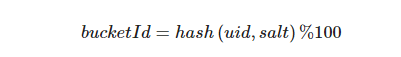 当流量进来后,实验分流服务会根据不同终端采用不同的用户标识id来hash分流,web端采用 cookieId ,app端采用设备id,小程序端采用 openID 作为唯一标识符。具体进行流量划分时,为了实现实验层之间流量划分的正交性,会将流量标识信息和实验层标识一起进行实验流量 bucket 划分, 实验层标识 salt 称为离散因子。如基于用户标识(uid)的流量划分: