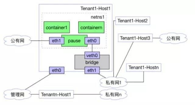 通过这个图我们可以看出,容器的网卡是直接连接到虚拟私有网络的 OVS 上的,和虚拟机是一个平的二层网络,在 OVS 来看,容器和虚拟机是在同一个网络里面的。