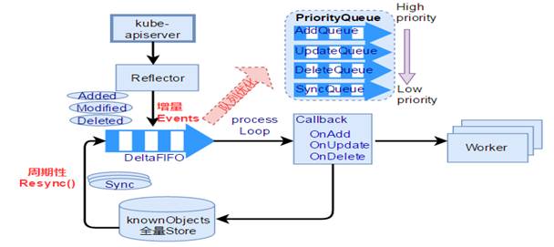 但基于事件模型的一个缺点是,总是通过 delta 进行事件触发,过了一段时间,就不知道是否同步了,因而需要周期性地 Resync 一下,保证全量的同步之后,然后再进行增量的事件处理。