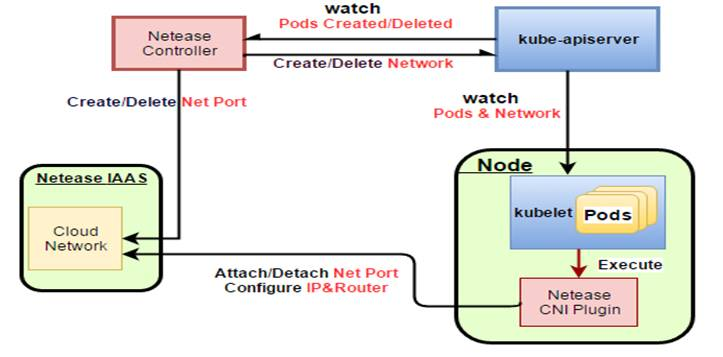 网易云开发了自己的 NeteaseController,在监听到有新的 Pod 创建时,调用 IaaS 的 API 创建 IaaS 层的虚拟网卡,然后在虚拟机内部,通过调用 Netease CNI 插件将虚拟网卡添加到容器里面。添加技术用的就是上一节提到的 setns 命令。
