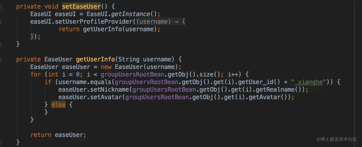 这一步是判断如果环信的username(也就是你list中头像旁边显示的id)等于你javaBean中的一个userId,之后