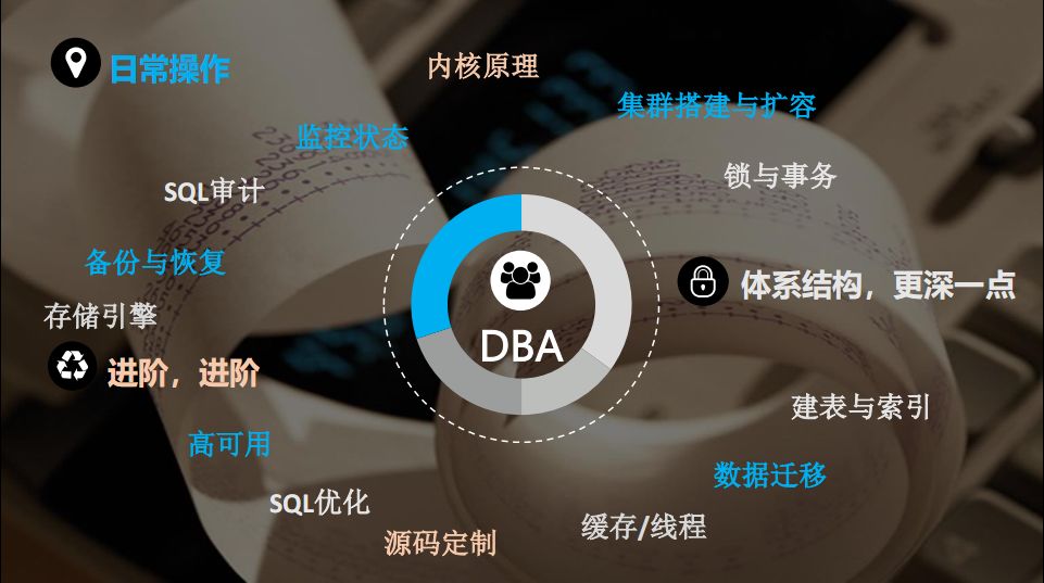 首先,我们来看看DBA的具体工作,我觉得 DBA 真的很忙:备份和恢复、监控状态、集群搭建与扩容、数据迁移和高可用,这是我们 DBA 的功能。