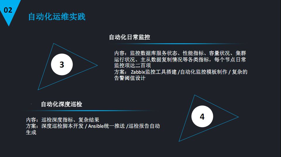 第四个就是自动化深度巡检,这个就是补充了监控所不能达到的地方。比方说如果我们需要扫描或者是看一些大表的情况或者是看一些没有建索引表的情况,它的输出很复杂,是一张表或者是几张表,所以我们就需要深度的巡检来完成。深度的巡检我们公司也是采用开发巡检脚本,通过Ansible统一推送,巡检报告自动生成。也就是说可以很明确的呈现出这个巡检的结果供DBA去看和去检查。