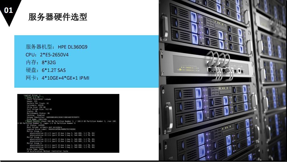 所以我们在选择服务器选型时候DBA是没有办法参与进去的。这个大家可以看一下,我们采用的服务器是惠普的DL360G9,CPU:是2核×e5-2650V4,内存是8×32G,硬盘是6×1.2TSAS,网卡是4×10GE+4×1GE+1IPMI。这是我们移动云的一些服务器的选型。