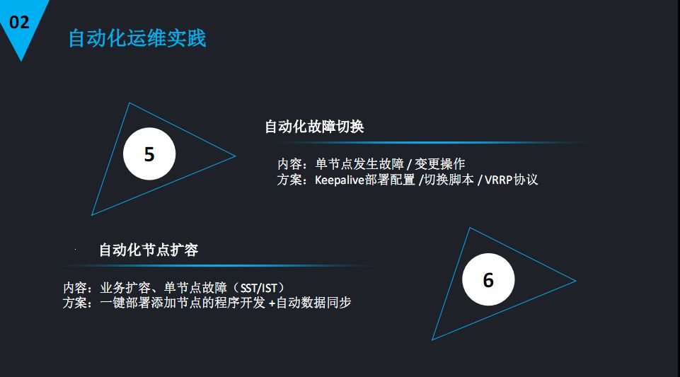 当第六点就是自动化节点扩容。当发生单节点故障的时候我们需要部署一个新的节点的时候就需要启动自动化的节点扩容,编写脚本来做。
