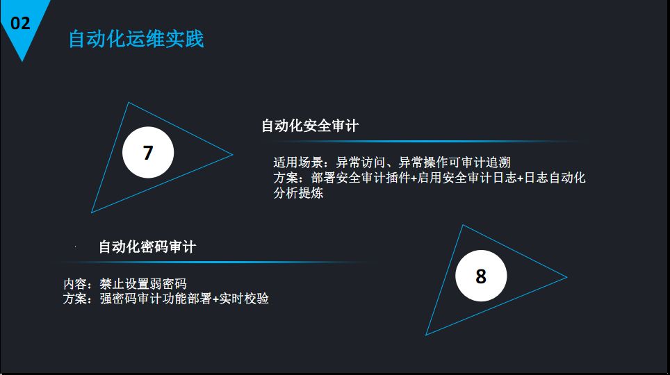第七点是自动化安全审计,就是异常访问,异常操作可审计追溯。部署安全审计插件,这个安全审计的插件+启用安全审计日志,+日志自动化或者是分析提炼。所以要不要开启这个插件根据各位公司对于安全审计方面的要求以及对于性能的要求从两者取一个平衡。因为我们还是很看中这个安全事件,所以我们开启了这个安全审计插件,开启这个插件以后还需要配置文件做一个配置。以什么样的方式存或者是多大?这些参数都可以在配置文件里面进行配置。