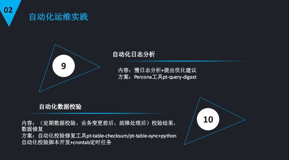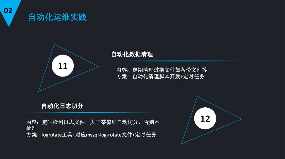 第十二点是自动化日志切分。如果数据库跑的时间比较长,慢日志或者是错误日志比较大,就需要定时检测日志文件,大于某值则自动切分,否则不处理。