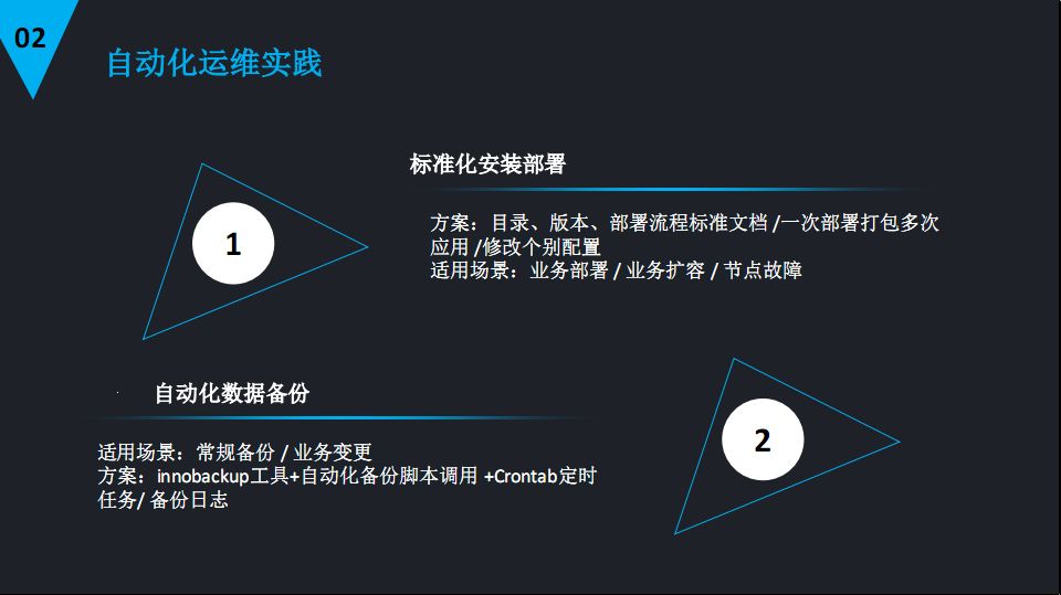 自动化的数据备份,数据备份是我们DBA非常重要的一个工作。所以我们公司也是建立合理有效以及规范的自动化备份的规范。比方说我们的常规备份,我们是每周一次全备,变更前后,有一个业务变更了,在这之前要做一个全备,万一业务变更哪里出现问题我就可以及时回退。这个是自动化使用的场景。我们使用的是innobackup工具+自动化备份脚本调用+Cronntab定时来做。