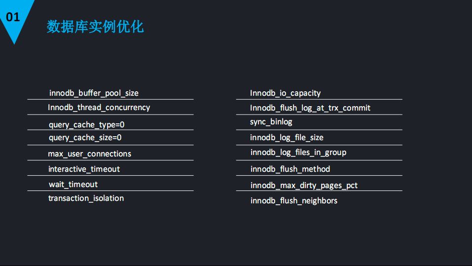 我列了几个参数我们在标准化的时候需要规范和配置的。这里不一一揭示了。这些参数大家都可以找到,重点看一下。其实这些参数很重要。因为它决定了我们实例的性能。某一些参数配置不合理,我们实例的性能就会受到很大的影响。
