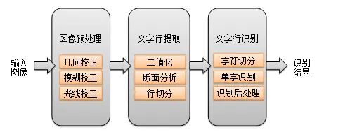 传统的OCR基于图像处理(二值化、连通域分析、投影分析等)和统计机器学习(Adaboost、SVM),过去20年间在印刷体和扫描文档上取得了不错的效果。传统的印刷体OCR解决方案整体流程如图2所示。
