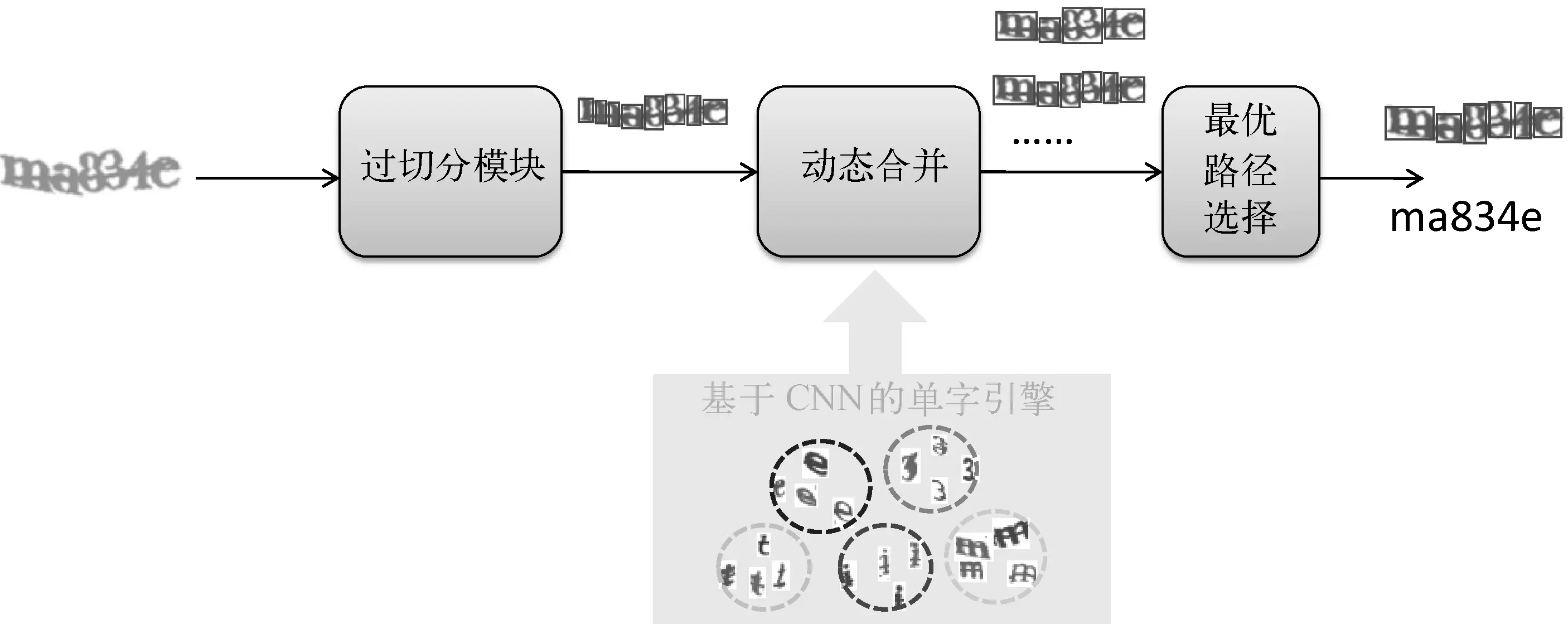 该方案试图将字符切分和单字符识别融合在同一个框架下解决,但由于过分割是独立的步骤,因此没有从本质上实现端到端学习。
