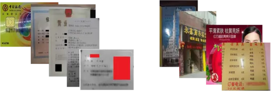 对于美团的OCR场景,根据版面是否有先验信息(卡片的矩形区域、证件的关键字段标识)以及文字自身的复杂性(如水平文字、多角度),图像可划分为受控场景(如身份证、营业执照、银行卡)和非受控场景(如菜单、门头图),如图8所示。