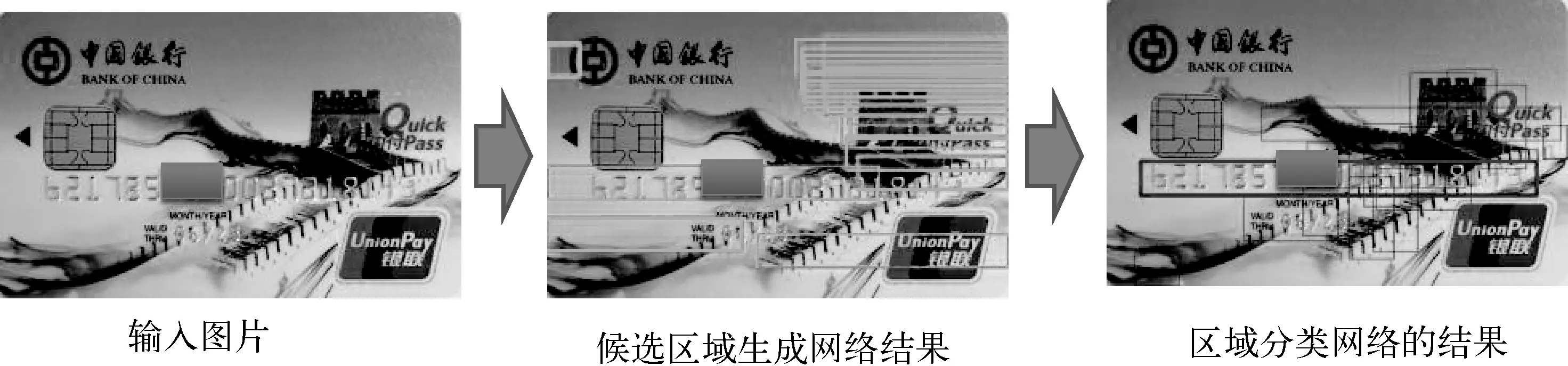 Faster R-CNN框架由RPN(候选区域生成网络)和RCN(区域分类网络)两个子网络组成。RPN通过监督学习的方法提取候选区域,给出的是无标签的区域和粗定位结果。RCN引入类别概念,同时进行候选区域的分类和位置回归,给出精细定位结果。训练时两个子网络通过端到端的方式联合优化。图10以银行卡卡号识别为例,给出了RPN层和RCN层的输出。