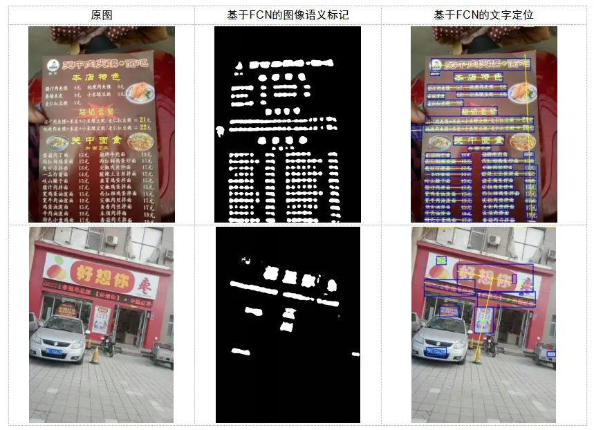 图14分别给出了在菜单和门头图场景中的全卷积网络定位效果。第二列为全卷积网络的像素级标注结果,第三列为最终文字检测结果。可以看出,全卷积网络可以较好地应对复杂版面或多角度文字定位。