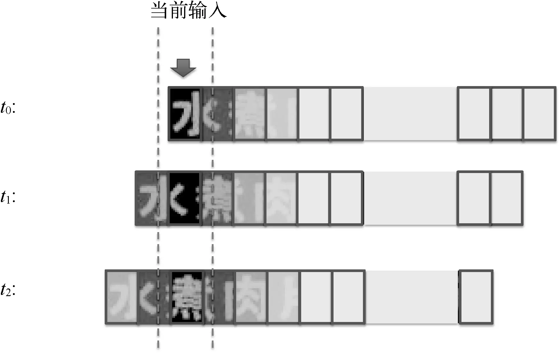 滑窗识别借鉴了滑动窗口检测的思路,基于离线训练的单字识别引擎,对文字行图像从左到右进行多尺度扫描,以特定窗口为中心进行识别。在路径决策上可采用贪心策略或非极大值抑制(NMS)策略来得到最终的识别路径。图6给出了滑窗识别的示意流程。可见滑窗识别存在两个问题:滑动步长的粒度过细则计算代价大,过粗则上下文信息易丢失;无论采用何种路径决策方案,它们对单字识别的置信度依赖较高。