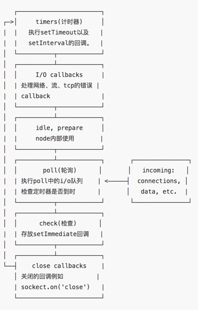 这个是定时器阶段,处理setTimeout()和setInterval()的回调函数。 进入这个阶段后,主线程会检查一下当前时间,是否满足定时器的条件。 如果满足就执行回调函数,否则就离开这个阶段。