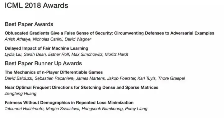 人工智能顶级会议 ICML 2018 即将于 7 月 10 日至 15 日在瑞典首都斯德哥尔摩举行。昨天,大会提前公布了最佳论文获奖名单,在超过 600 篇被接收论文中,来自 MIT 和 UC Berkeley 的研究人员分享了最佳论文的殊荣。值得一提的是,此前攻破 ICLR 2018 大会七篇对抗样本防御方法的研究众望所归地成为了最佳论文。