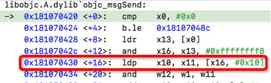 其次,通过汇编代码分析objc_msgSend方法,我们可以得知objc_msgSend + 16这一行代码(如下图2)是在读取当前OC方法的receiver的isa指针偏移0x10的处的值(见附录推荐的objc_msgSend链接文章),由于对象已经被释放了,所以读取该地址导致了读取错误地址,也即产生了野指针Crash。