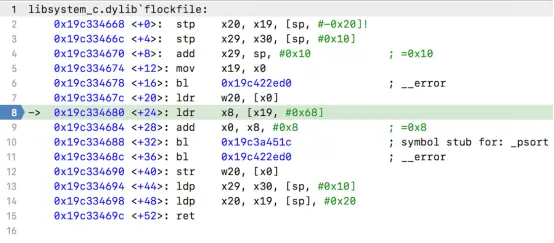于是我们通过Xcode调试到flockfile函数,并定位到 + 24的位置(如下图6断点的位置)