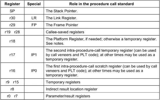 x0到x7用来做参数传递,以及从子函数返回结果(通常通过x0返回,如果是一个比较大的结构体则结果会存在x8的执行地址上)