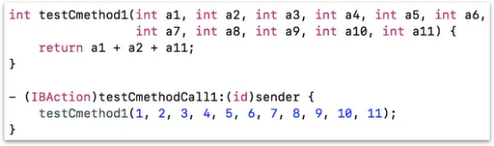 如图9有两个方法,OC方法是一个按钮点击事件,点击后调用上面的C方法,为了调试方便C方法有11个参数,本例中入参的值是1到11,可以观察到超过8个参数时是怎么传参的。