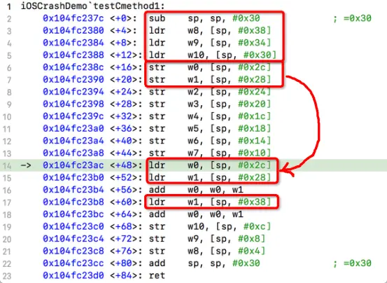 进入C函数的汇编代码,我们先明确下这段C函数的任务是:return a1 + a2 + a11,所以应该是把OC函数中w0、w1、w13(w13存在栈上[sp, #0x8])的值拿出来相加,得到的结果存到x0上,然后返回,所以: