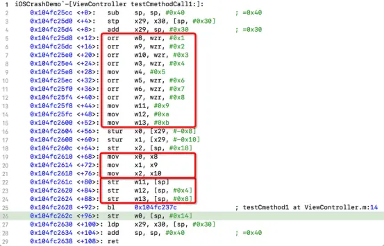 接下来直到str w13, [sp, #0x8] 都是在为调用C方法准备参数,因为没有经过优化所以显得很啰嗦。