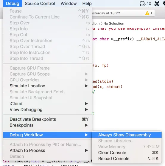 为了看到调用过程的汇编代码,我们需要在- (IBAction)testCmethodCall1:(id)sender中设置断点,然后在Xcode中设置Always Show Disaasembly(见图10),这样调试过程中看的就是汇编代码了