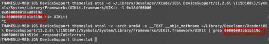 4)如果用atos查找出来的结果仍然是个地址,还需要在mach-O文件的__TEXT段或__RODATA段的__objc_methname中进一步查找(注意:第一个红框中查询出来的0x在otool查找Mach-O文件中要去掉)