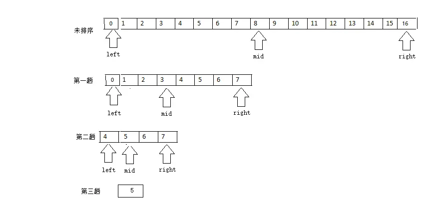 - 如果left不大于right那么我们就还没有查找完毕,继续进行第一步。如果left已经大于了right,那么就代表在这个数组里我们没有找到想要的数据。