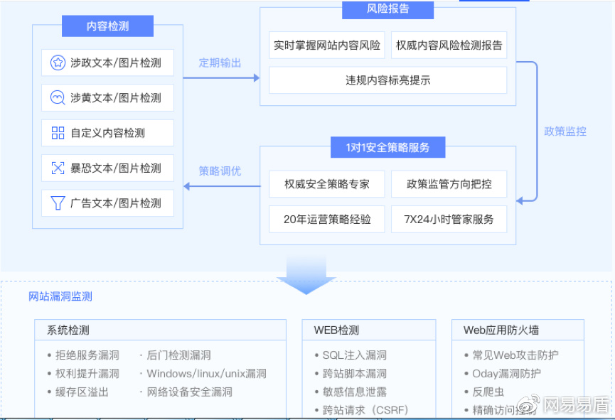 面向政企网站,易盾还量身定制推出了轻量级安全监测服务,重点监控网站内容风险和Web漏洞。无需部署设备和技术支持,就可以快速接入易盾综合风险评估能力,对网站内容和网络风险定期扫描、提前预防,易盾还提供1对1安全策略顾问咨询服务。