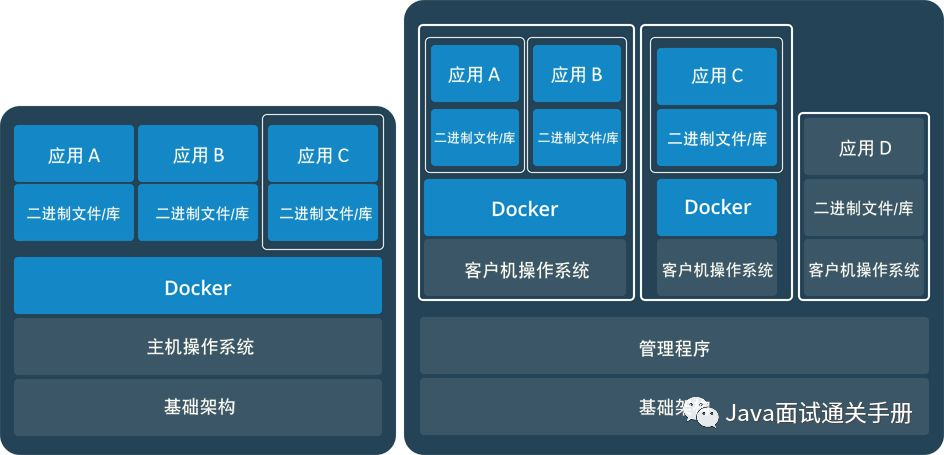 虚拟机 (VM) 是一个物理硬件层抽象,用于将一台服务器变成多台服务器。 管理程序允许多个 VM 在一台机器上运行。每个VM都包含一整套操作系统、一个或多个应用、必要的二进制文件和库资源,因此 占用大量空间 。而且 VM 启动也十分缓慢 。