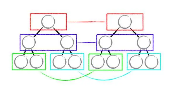 基于tree diff策略,React对Virtual DOM树进行 分层比较、层级控制,只对相同颜色框内的节点进行比较(同一父节点的全部子节点),当发现某一子节点不在了直接删除该节点以及其所有子节点,不会用于进一步的比较,在算法层面上就是说只需要遍历一次就可以了,而无需在进行不必要的比较,便能完成整个DOM树的比较。