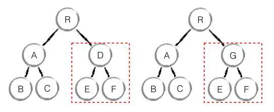 如下图,当 component D 改变为 component G 时,即使这两个 component 结构相似,一旦 React 判断 D 和 G 是不同类型的组件,就不会比较二者的结构,而是直接删除 component D,重新创建 component G 以及其子节点。虽然当两个 component 是不同类型但结构相似时,React diff 会影响性能,但正如 React 官方博客所言:不同类型的 component 是很少存在相似 DOM tree 的机会,因此这种极端因素很难在实现开发过程中造成重大影响的。