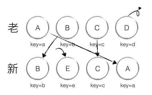 上述分析的是新老集合中存在相同节点但是位置不同,要是有新加入的节点且有旧节点需要删除呢?这里不再啰嗦,如下图: