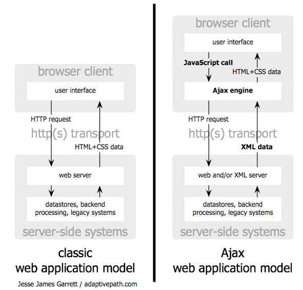 图片左侧的部分是有AJAX之前的浏览器与服务器交互的方式,是同步的,发出请求之后需要等待,这样的体验就非常不好。AJAX的出现改变了这一情况,由不同变成了异步,发出请求之后不再需要等待。