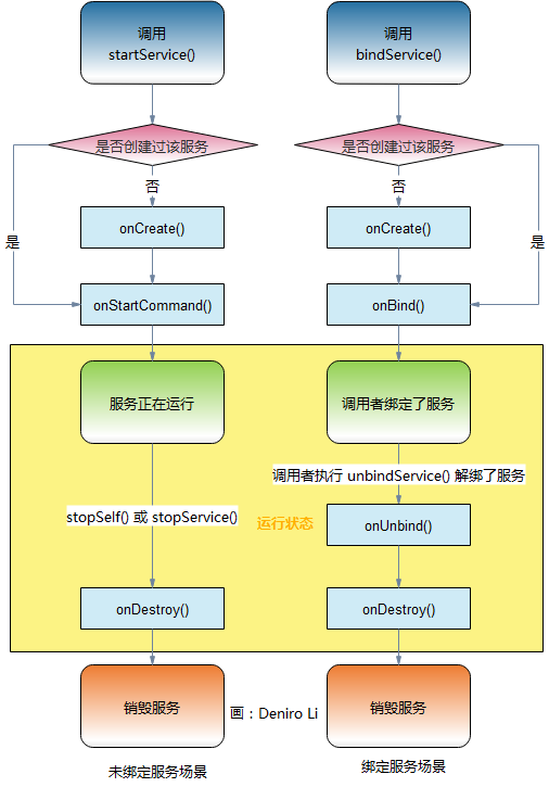 说说 Android 服务的生命周期 deniro 2018-06-30 143 阅读1分钟 每次调用 startService(),onStartCommand() 都会执行。 每个服务只会存在一个实例。 调用 bindService() 之后,只要调用方和服务之间的连接没有断开,服务就会一直保持运行状态。 如果对一个服务,即调用了 startService() 又调用了 bindService(),那么就必须调用 stopService() 与 unbindService() 方法,才能销毁服务。