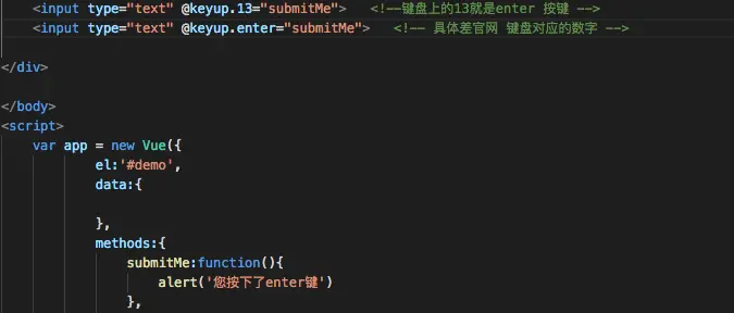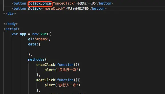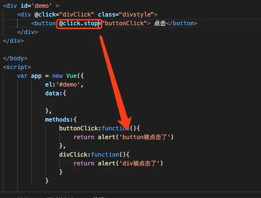 Vue 修饰符 chenfeng900000029 2018-06-30 118 阅读1分钟 .stop 阻止单击向上冒泡 添加.stop 只有buttonClick 弹窗触发 prevent 提交表单时页面不刷新 不重载(要写在form里) self 只是作用在元素本身 子元素不执行 点击子元素 不会触发divClick 点击div 也不会触发buttonClick once 只执行一次 加了once修饰的只会执行一次弹窗 监听键盘