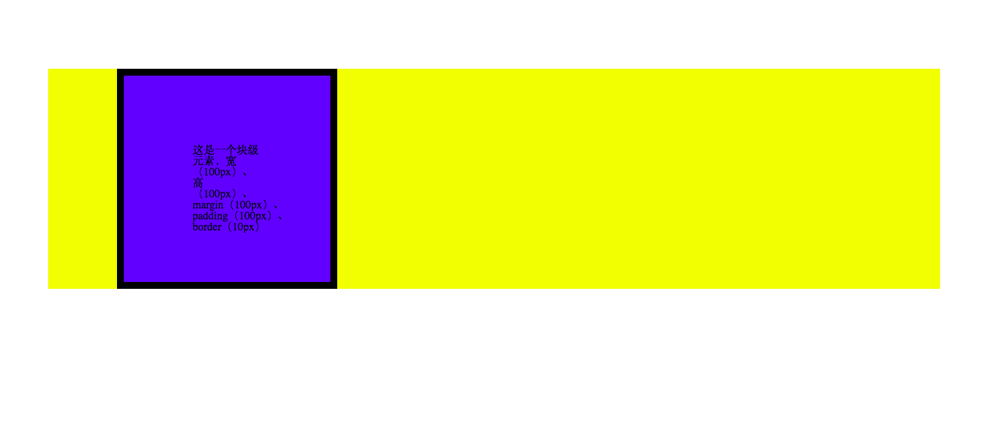 <p>这是一个块级元素,宽(100px)、高(100px)、margin(100px)、padding(100px)、border(10px)</p>
