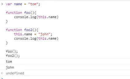 我们在浏览器上打印,定义了一个全局变量name,foo和foo2 的方法是全局调用,this的指向是全局window;同时在foo2 下,this.name 可以被修改,但是this的指向依然是window对象。