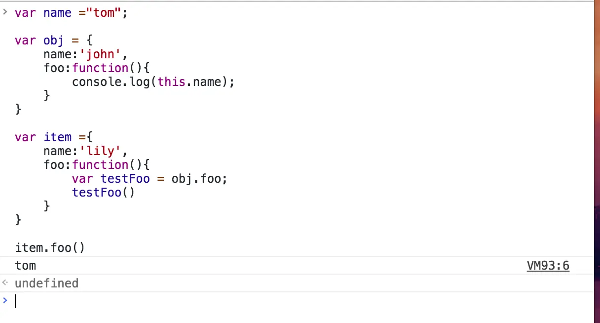 图2中,同样在obj 和item 上同时绑定foo,但是item.foo中重新定义了testFoo,这个testFoo没有绑定到foo上,也没有绑定到item上,所以这个testFoo 是个匿名函数,this直接指向window;testFoo() == window.testFoo();