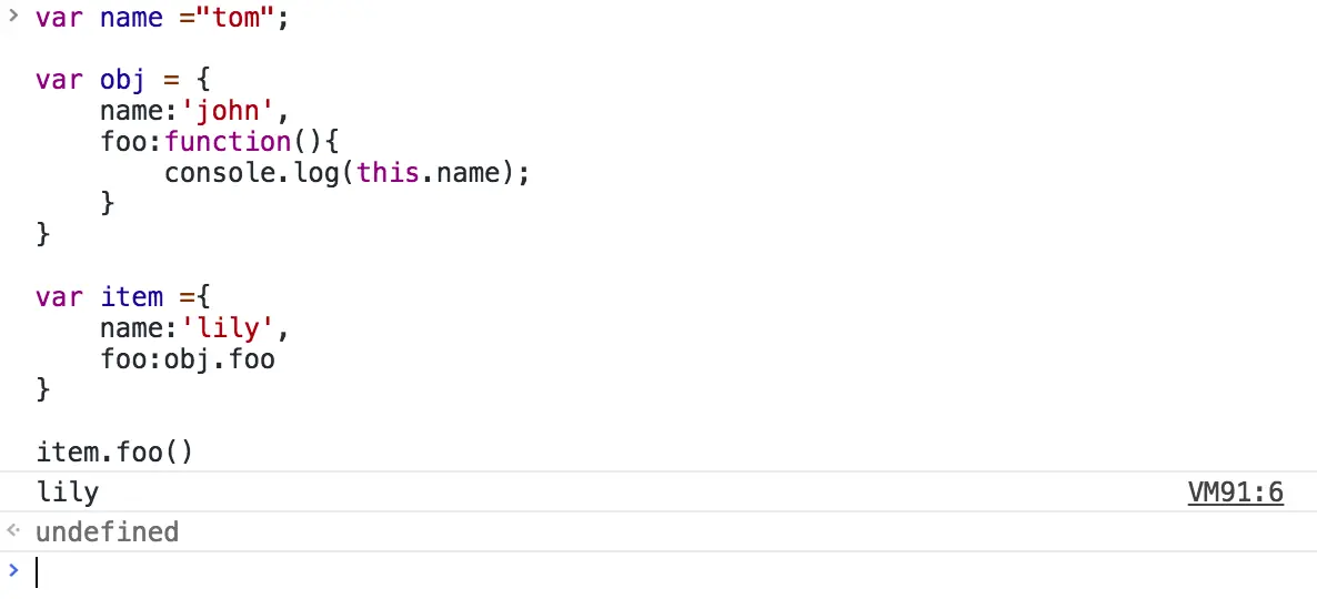 图1中,分别在obj和item上绑定foo(),同时item.foo()=obj.foo(); 在调用item.foo()时,this指向的对象为item,这就显示this的指向对象为调用位置对象。