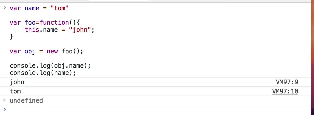 定义一个obj 构造函数。this的指向为obj,obj.name 为 “john”,同时没有改变全局name值。