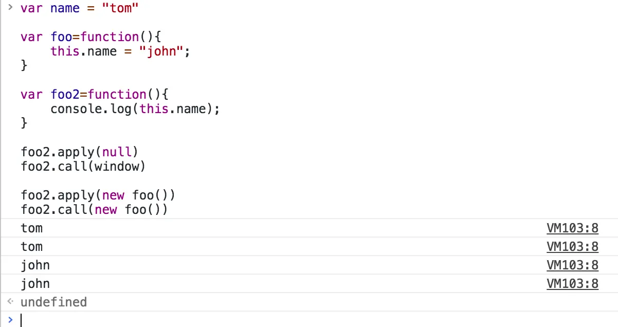定义全局name 为“tom”,apply/call 指向null 默认为window对象;