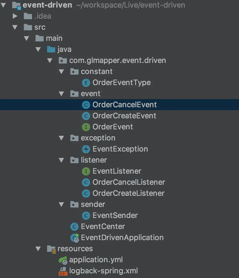理论部分说到事件和监听器的关系可以是1:1、1:N、N:M,这里基于 spring boot 编写一个事件:监听器=1:N的实现,老套路,跟着上面的流程分析走: