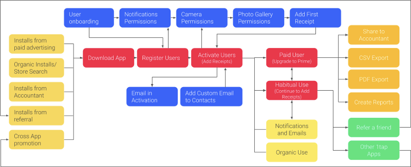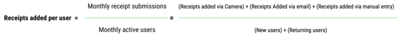 这里的关键是每个用户添加的收据,这就是北极星指标。可以把它分解成每个月活跃用户(MAU)提交的收据。反过来,它也可以继续分解成每个通过不同途径添加收据的用户 — 扫描,电邮,手动输入 — 以及新用户和回头客。