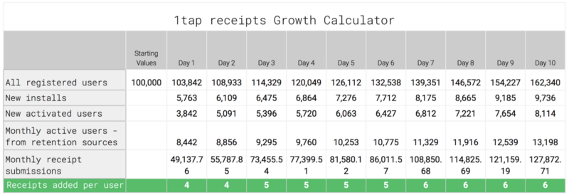 有了表格之后,1tap 开始探索了十几天各种活动对于用户平均收据数量的影响。Jon 发现这么做的好处就是他们能看到微小的改变给团队带来的好处。比如当下载到注册的转化率提升 2% 的时候,收据总数翻了一番。对比之下,从注册到激活到转化的提升对于总数的影响只有 75%。