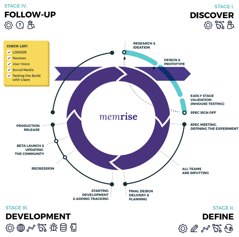 就像 Kristina 所说的那样,我们需要将这个具有创造性和实验性的思维方式逐渐灌输到团队和公司中。Memrise 把产品的开发周期分为 4 个阶段:探索,定义,开发,和跟进。